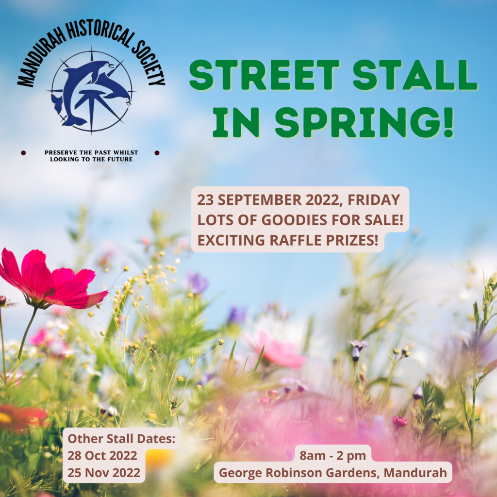 Mandurah Historical Society will be holding a Street Stall at George Robinson Gardens on 23 September 2022, Friday, from 8am – 2pm. We will have lots of goodies for sale including homemade cakes/slices, jams, preserves, plants, clothing, bric-a-brac, children’s toys, board games, books and lots more. There will also be a raffle where you can win great prizes!