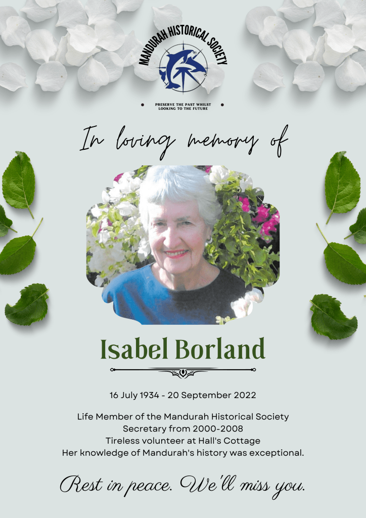 Isabel was a welcome presence at the Mandurah Historical Society office, rarely missing opportunities to attend meetings or be at morning and afternoon teas and other celebrations. She was also a reliable Sunday volunteer at Hall’s Cottage, regaling other volunteers and visitors with her extensive knowledge of the history of Mandurah.